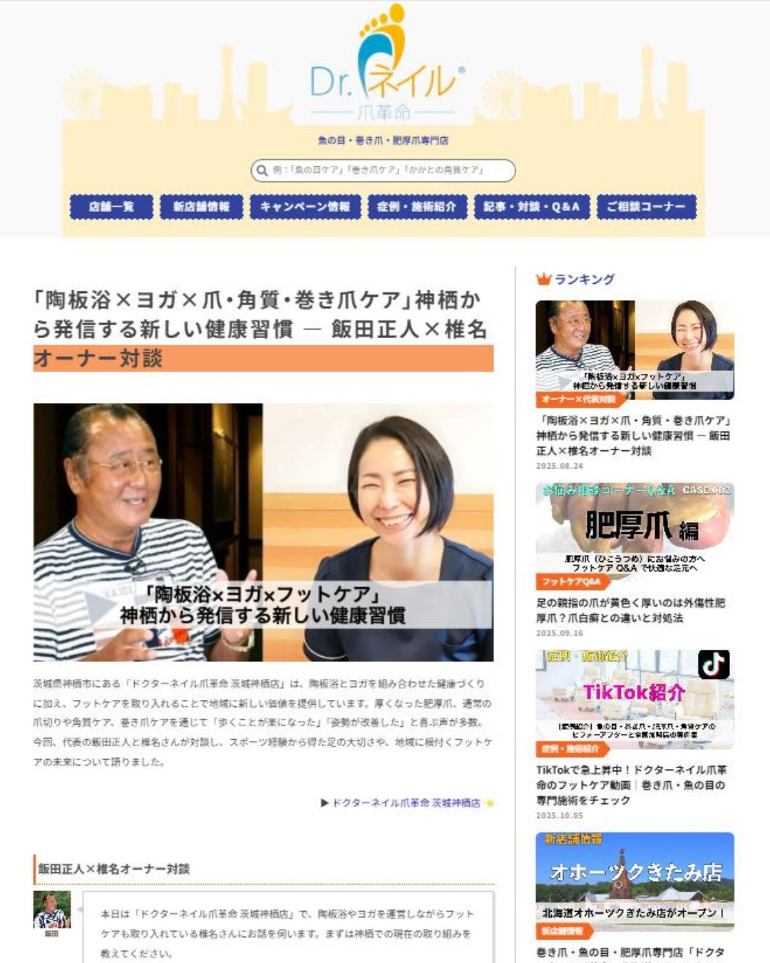 足の健康に関する情報を網羅した総合ポータルサイト『世界のフットケア情報館』に、ドクターネイル爪革命グループ創業者である飯田正人代表と、当店オーナー椎名の対談記事が掲載されました。